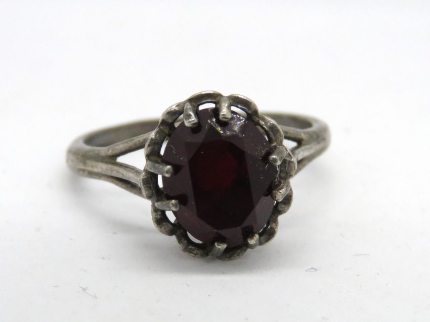 A white metal ring having central red stone, no apparent hallmarks, size O.