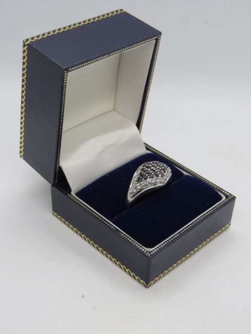 A silver cocktail ring encrusted with white and black cz stones, stamped 925, size S.