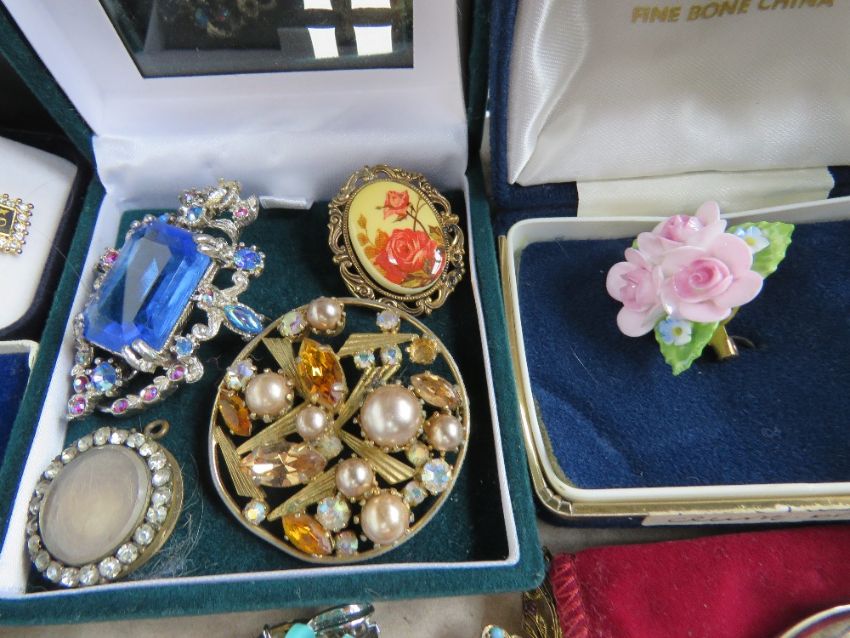A quantity of assorted costume jewellery inc faux pearls, clip-on earrings, brooches, etc.