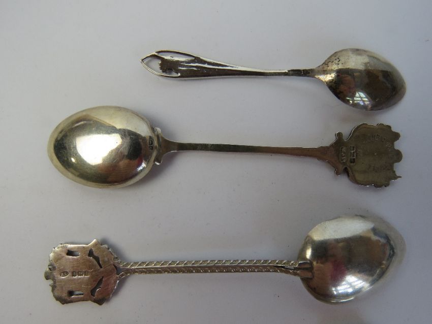 A sterling silver New York themed souvenir spoon together with two HM silver spoons and an EPNS spoon and two spoons having unknown marks. Six items. Silver weight 32.9g / 1.07ozt.