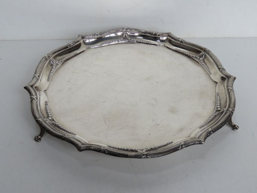 A hallmarked silver salver raised over three outswept feet, HM for London with Goldsmiths & Silversmiths Co retailers mark upon. Approx 31cm dia. 700.9g / 22.54ozt.