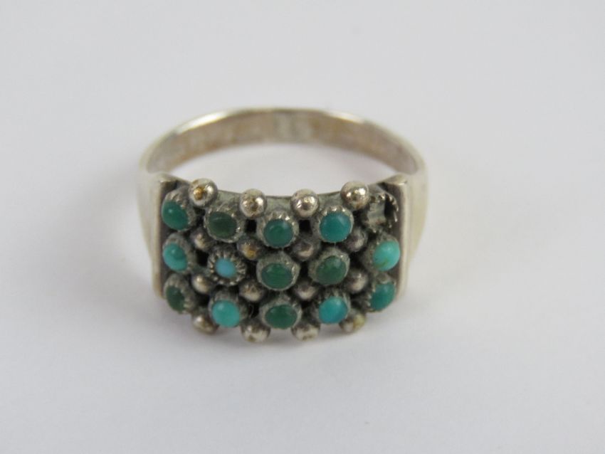 A handmade Native American turquoise ring, one stone deficient, unmarked white metal, maker's mark T-A. H, size N-O.