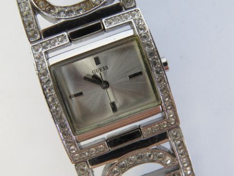 A ladies white stone encrusted wrist watch by Guess, case back deficient.