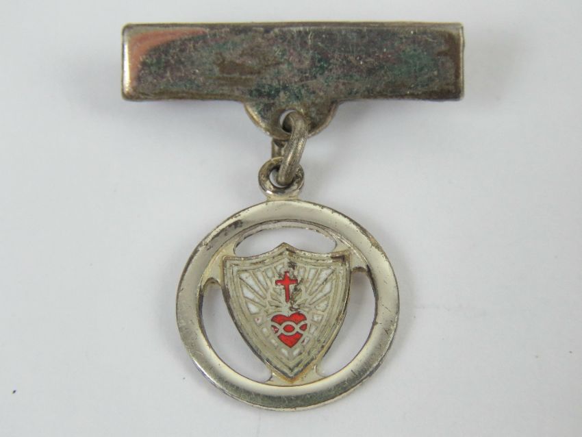A hallmarked silver Sacred Heart enamelled brooch, 3cm in length.