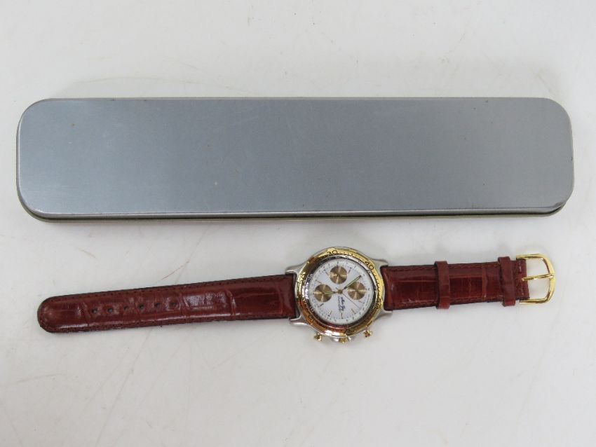A contemporary Chronograph wrist watch on leather strap in metal presentation box.