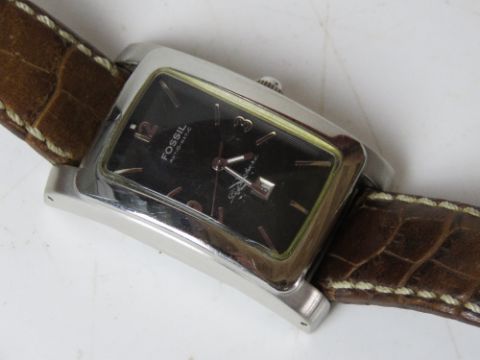 A men's Fossil Aut-O-Matic Signature wrist watch having skeleton back, black dial with date aperture. Light scratch noted to glass. On original Fossil strap
