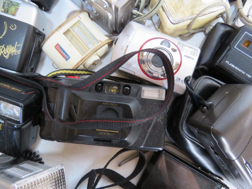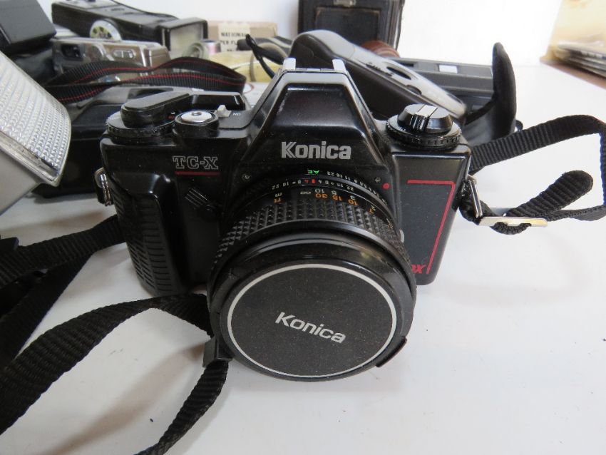 A quantity of assorted cameras and accessories inc Konica TC-X, Chinon, Flashmatic, etc. Disclaimer - all items in this sale are sold as untested without guarantee.