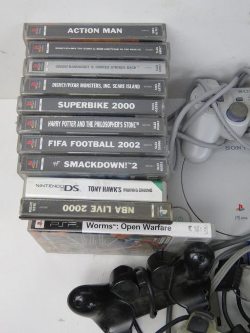 A quantity of video games, consoles and accessories, inc PS1, PS2, Wii, and various Playstation controllers, games, memory cards, etc. Disclaimer - all items in this sale are sold as untested without guarantee..