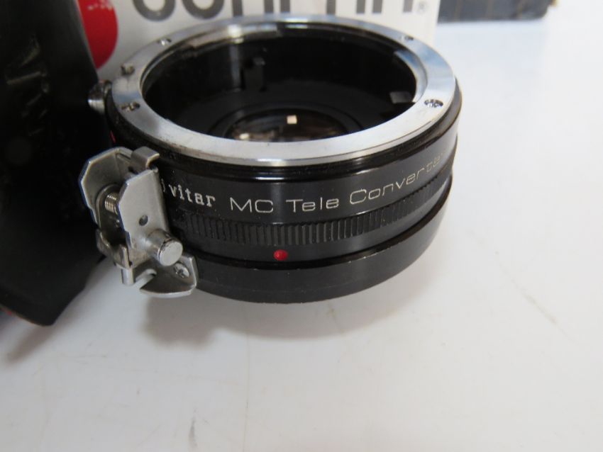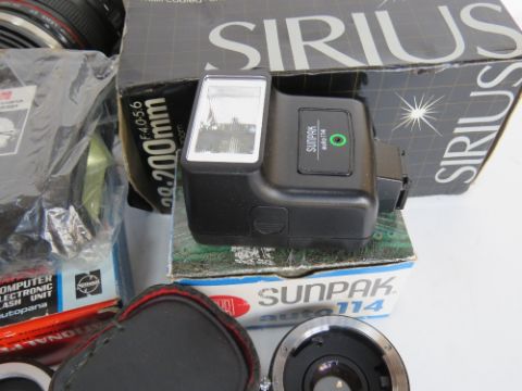 A quantity of camera equipment inc lenses by Sirius, Vivita, Prinzflex, a Sumpak Auto114 flash, etc. Disclaimer - all items in this sale are sold as untested without guarantee.
