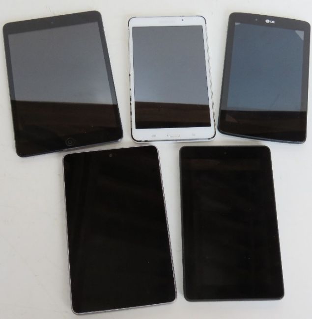 Apple iPad mini in grey model A 1432 7.9" screen. Together with LG G pad, Amazon Fire 7, Samgung Galaxy tablet7" screen, and an Asus Nexus 7. Five items. Disclaimer - all items in this sale are sold as untested without guarantee.
