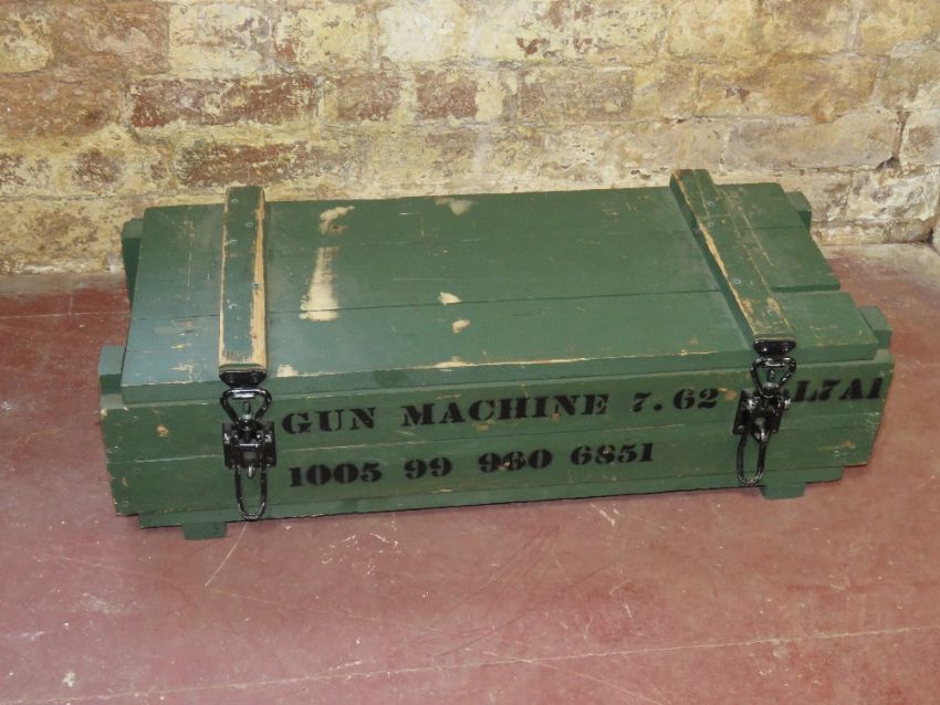 A GPMG 7.62 machine gun transit box, some slight damage noted within but is repairable. Approx. 79 x 32.5 x 23cm high.