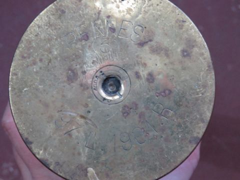 An inert WWI French 75mm shell, fuse unscrews, projectile is semi pitted. Approx. 62cm tall.