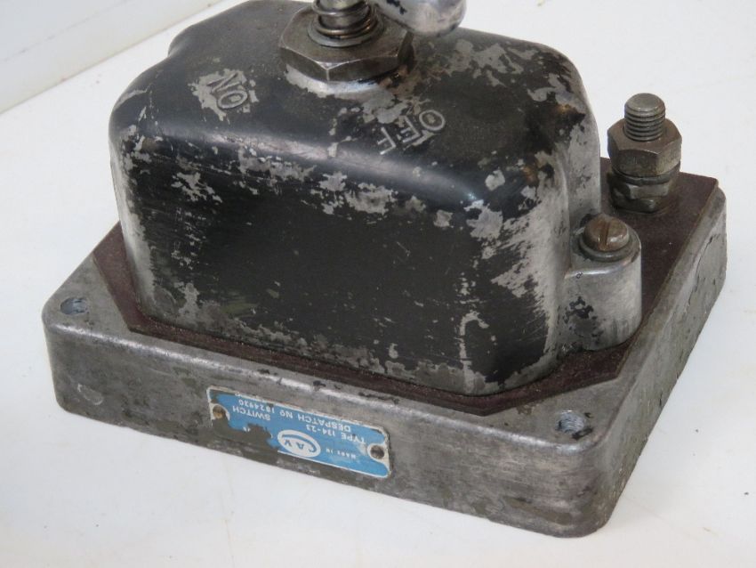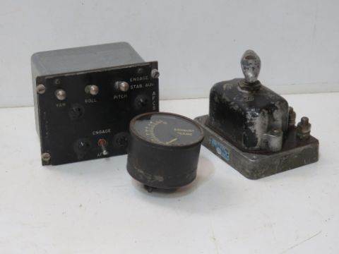 An F-86 exhaust gas temperature EGT Indicator, as used in the US Air Force fighter jets F-86 Sabrejet, F-84 Thunderjet, F-100 Super Saber and the T-33 shooting star, with Identity plate on the back and Lucas Cav 134-23 battery isolator switch, designed for heavy vehicles, early type + F-4 Navigation/Communication Instrument, with the identity plate on the back.PT No. 756D493G1.