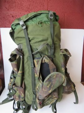 A Berghaus camouflage military rucksack containing a large quantity of kit inc black leather boots, webbing, belt, etc.