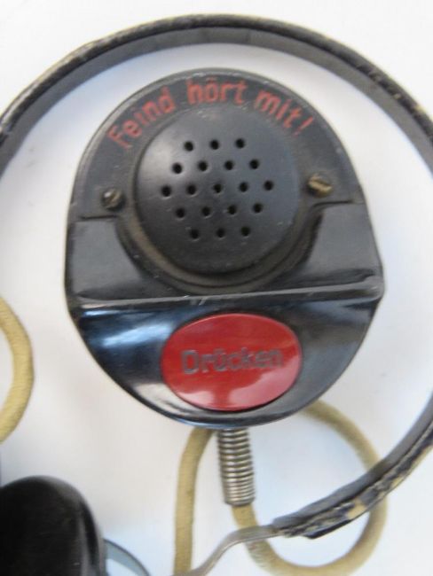 A WWII German head set with mic, head set bears makers code Dfh.a. and dated 1942. Mic has Waffenamt mark to the back.