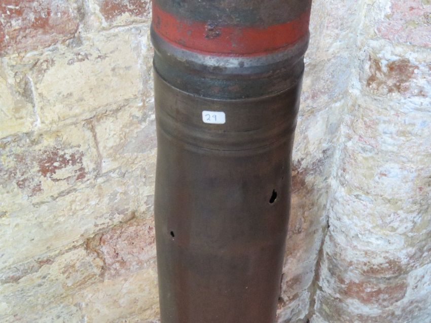 A WWII German 10.5cm Flak38 hollow charge shell dated 1944 and bear German markings. Together with fuse dated 1943.