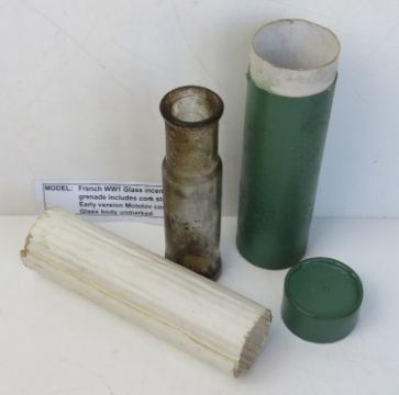 An inert WWI French Glass incendiary grenade includes Cork Stopper, early version of the Molotov Cocktail.