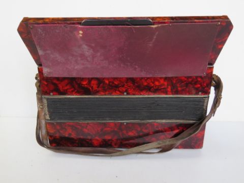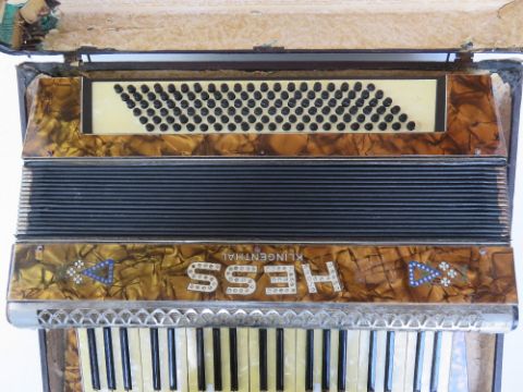 A Hess Klingenthl piano accordion in original case, mother of pearl effect key, 48.5cm wide, one latch to case a/f.