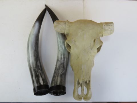 A composite skull with horns (one horn tip a/f) approx 140cm wide x 47cm high.