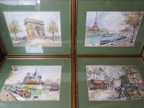 A set of four city scene prints including Arc de Triomphe, Eiffel Tower, etc, in matching frames, each measuring 48 x 38.5cm overall.