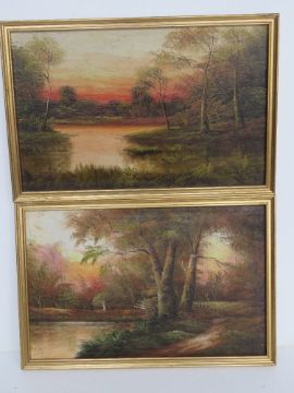 A pair of oil on canvas forest scenes, each signed indistinctly lower right. Each framed and measuring 37.5 x 25cm overall.