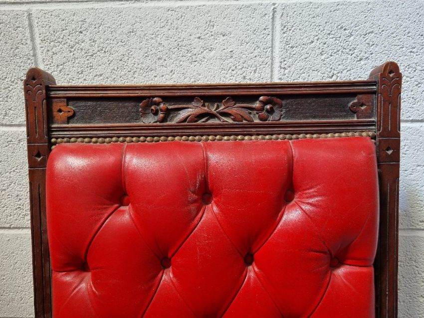 A Victorian Gothic Revival library chair upholstered in red leather and having floral carving to back, raised over turned legs to front, approx 72cm wide, 78cm deep, 101cm high, some seat studs deficient, horse hair stuffing to arms.