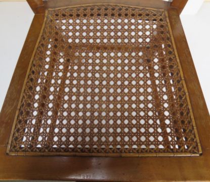 A single cane seated bedroom chair having carved back.