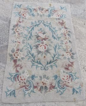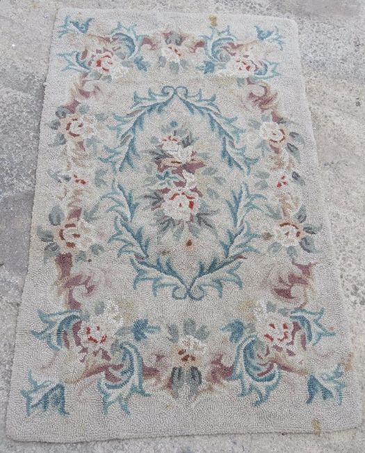 A vintage woollen rug in floral pattern on cream ground, for cleaning. Measuring approx 153 x 93cm.