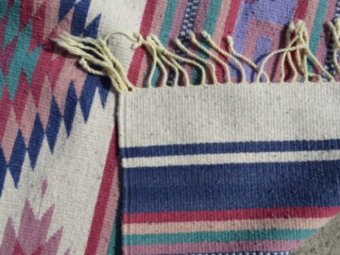 A contemporary woven 'garden rug' in multi coloured Aztec pattern, measuring approx 143 x 74cm.