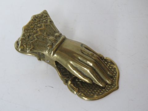 A brass desktop paper weight clip in the form of a ladies hand.