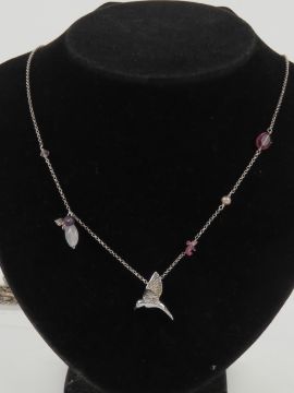 A silver necklace having hummingbird pendant, pearl, crystal and floral decoration upon, clasp stamped 925, chain measuring 45.5cm in length.
