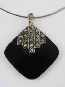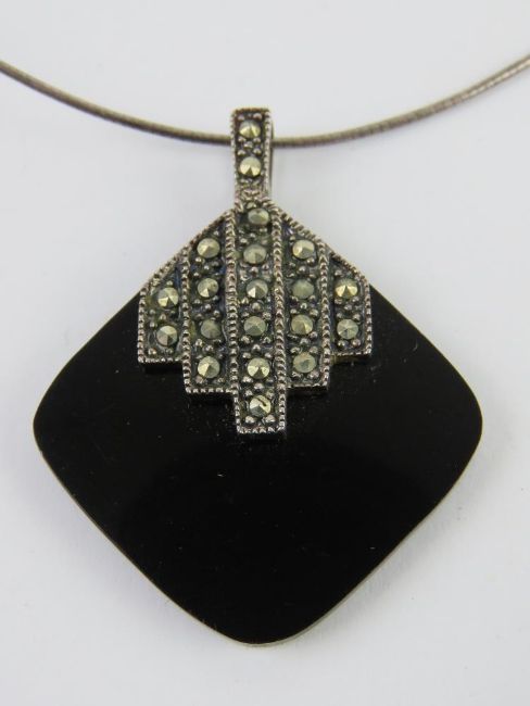 An Art Deco style silver and marcasite pendant measuring 4cm in length, stamped 925, on 925 silver articulated chain.