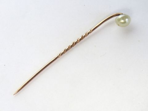 A 9ct gold cravat pin having synthetic pearl finial, stamped 9ct.