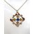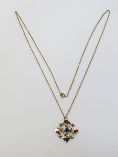 An Edwardian 9ct gold pendant having floral design with central blue paste stone, stamped 9ct, on unmarked yellow metal chain, 2.7g.