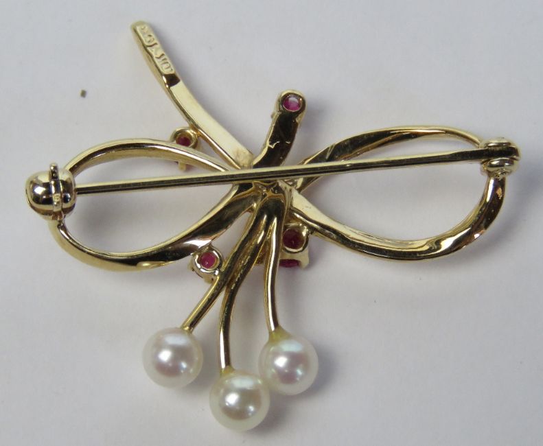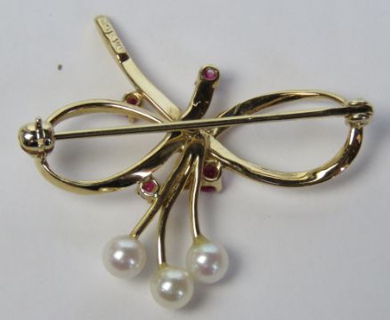 A 10ct gold brooch in the form of a bow with pearl 'mistletoe', four round cut rubies over, stamped 10k and measuring approx 3cm wide, pearls approx 3-4mm dia, 2.5g.