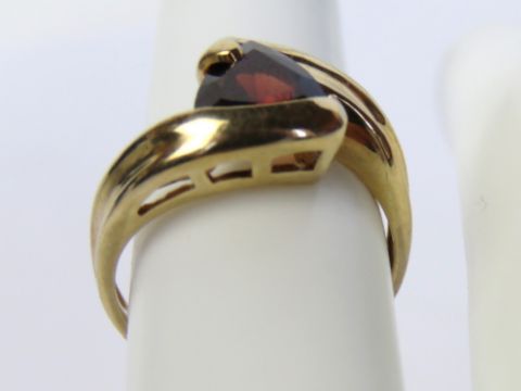 A 9ct gold and garnet ring, the single triangular cut stone in rubover twist style setting stamped 9k, size N, 3.3g.