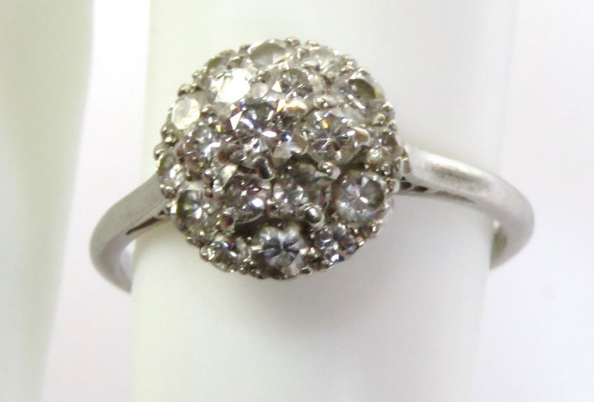 A vintage diamond and platinum cluster ring, the central floral cluster on two tiers containing seven claw set round cut diamonds, the third tier being circular and having alternating round cut diamonds (six larger, six smaller), the white metal band stamped Platinum with makers mark A&(?), size P, 4.2g. Central stone approx 3.2mm dia.