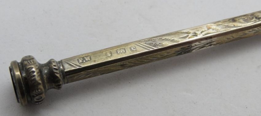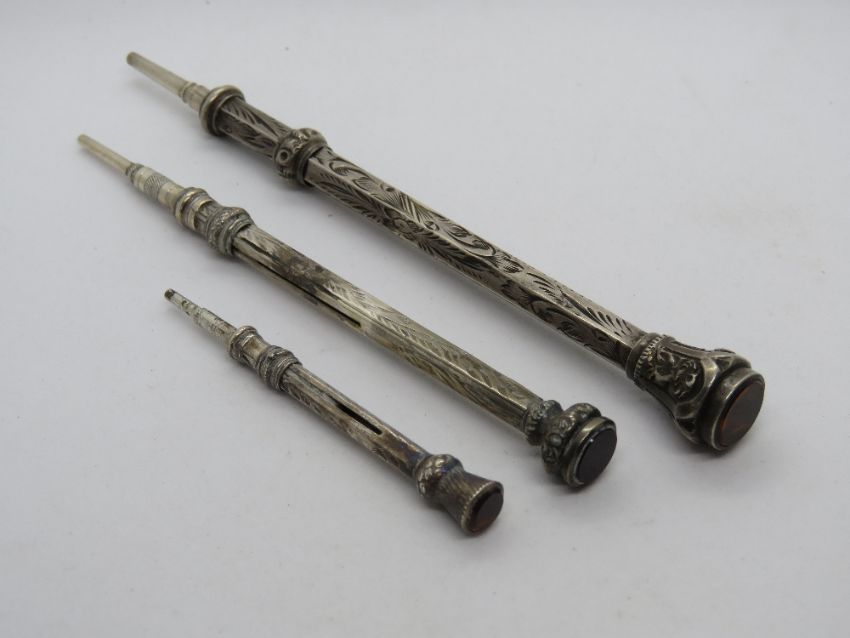 Three propelling pencils the smaller two hallmarked for Birmingham, larger, no apparent hallmark, smallest in thistle design, each having paste stone top.