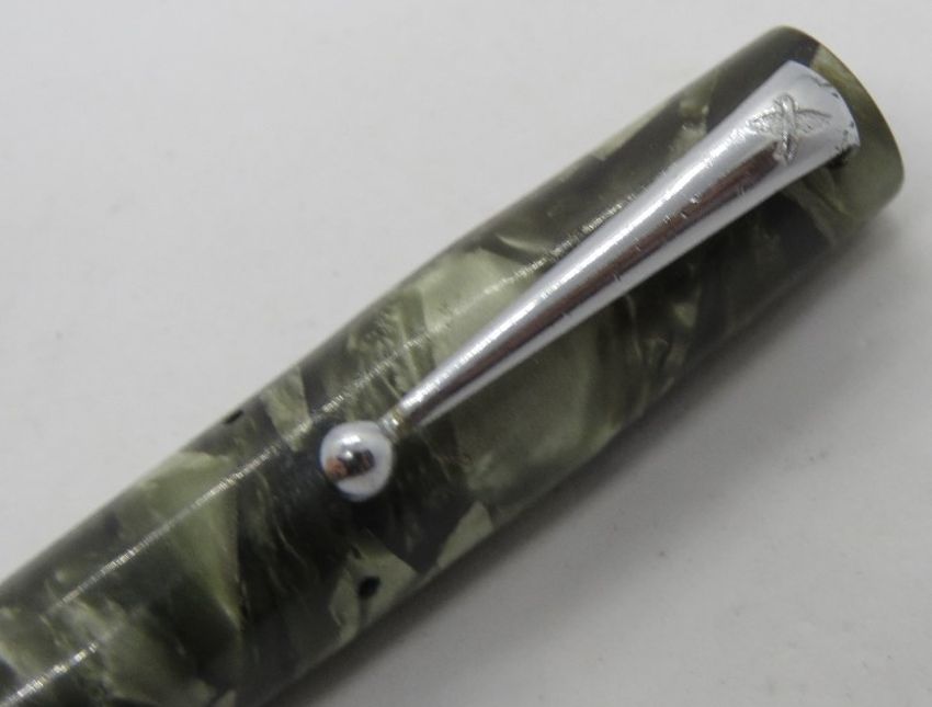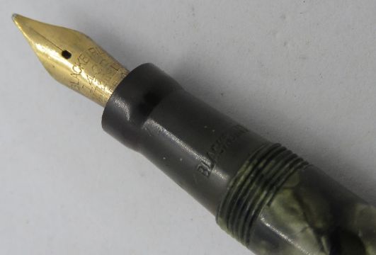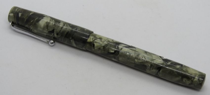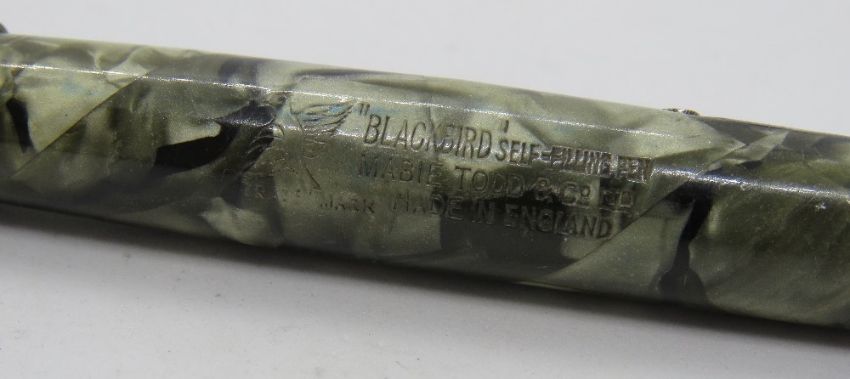 A Mabie Todd Blackbird fountain pen with 14ct gold nib, lever fill, in green marble pattern, c.1946.
