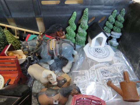 A quantity of dolls house outdoor decor including bistro sets, trees, Santa sleigh, bird house, horses, dovecote, etc.