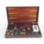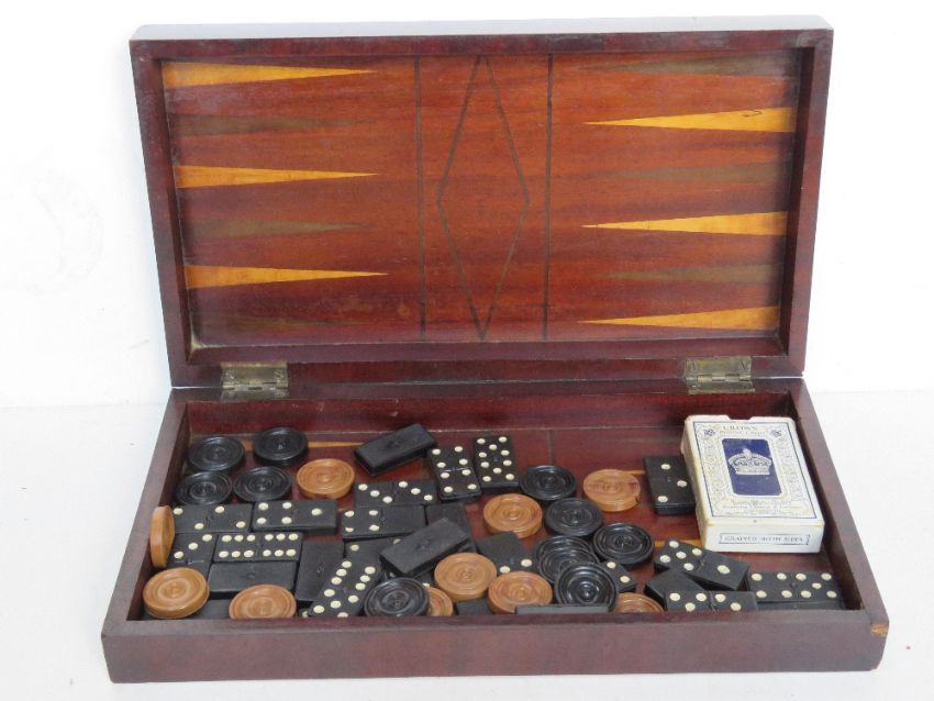 An inlaid wooden chess / draughts / backgammon board opening to reveal various pieces within.
