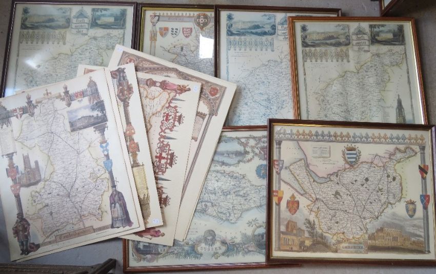 A quantity of late 20thC cartographic prints inc maps of Sussex, Northamptonshire, Cheshire, Cambridgeshire, Buckinghamshire, etc. Six framed, seven loose.