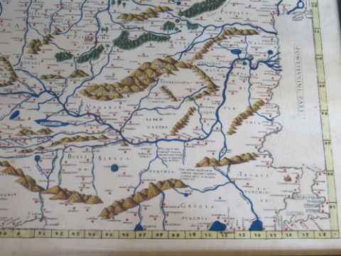 Print; map of Eastern Europe in Latin inc Transylvania, Austria, Germania, etc, in Hogarth style frame, overall size approx 45 x 32cm.