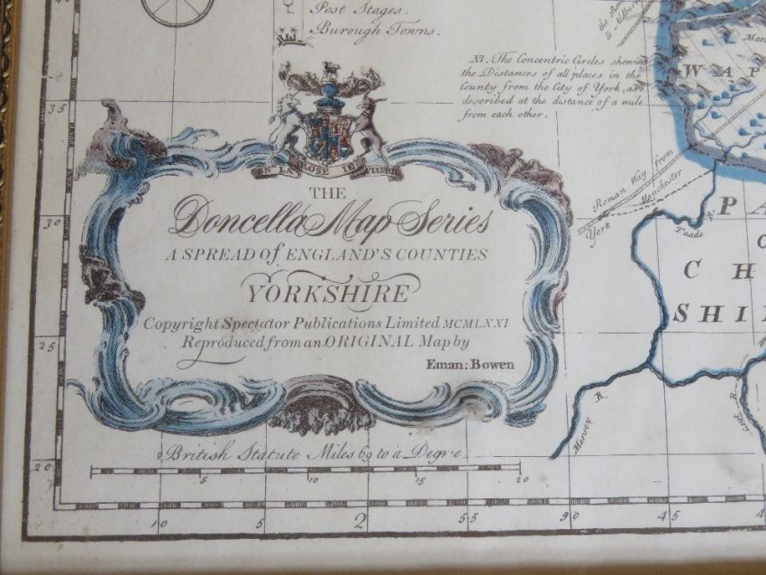 Print; 'The Doncella Map Series Yorkshire' from an original map by Eman Bowen in Hogarth style frame, overall size approx 57.5 x 45cm.