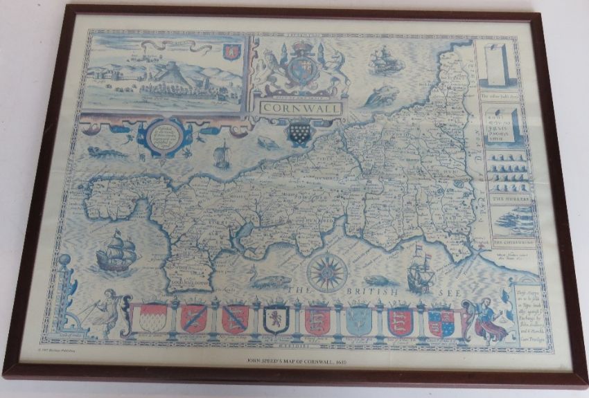 Print; John Speed's map of Cornwall, published 1997 by Heritage, framed and glazed and measuring approx 57 x 45cm overall.