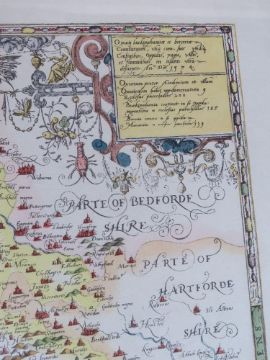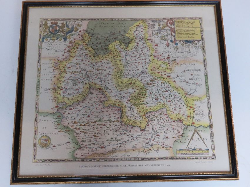 Print of Saxton's Map of Oxfordshire, Buckinghamshire and Berkshire, printed by Taylowe 1962 in Hogarth style frame, measuring approx 55.5 x 50cm overall.