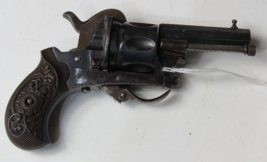 An antique Pinfire 6mm Calibre Revolver with fold down trigger. Belgium manufacture dated around the 1870s. Fully working action, with tight lock-up. Obsolete Calibre, no licence required.