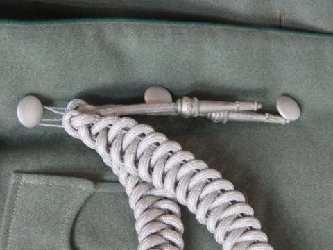 A WWII German Officers Administrative 4 pocket tunic, with the officer aiguillette, On the left breast a ribbon bar is still present and a pair of officer shoulder boards with the rank of a Kriegsverwaltungsinspektor (comparable with Oberleutnant or Lieutnant 1st class. The clasp of the tunic bears the markings DRGM RZM M5/8.