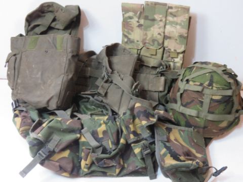 A quantity of assorted webbing inc helmet with camouflage cover.