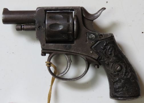 A deactivated Belgian Bulldog Type .22 LR Calibre ten shot revolver with handmade leather holster. Latest EU spec, so moving trigger, hammer, and revolving clear cylinder, non firing action. With certificate.